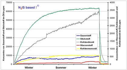 Fig.1 zeigt die typischen Konzentrationsverläufe ausgewählter Gase bis zur Sättigung mit Stickstoff.